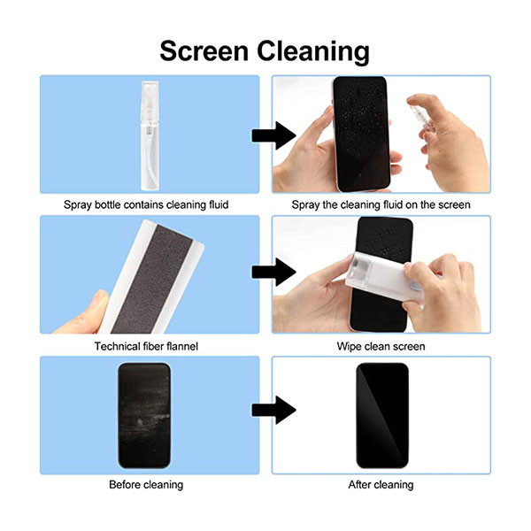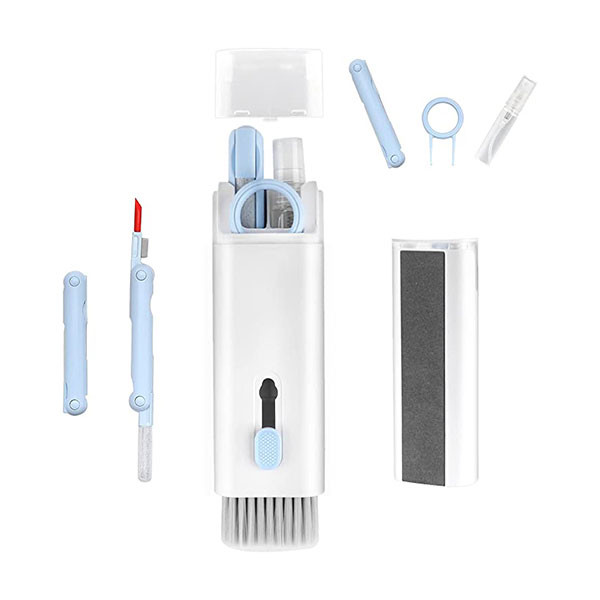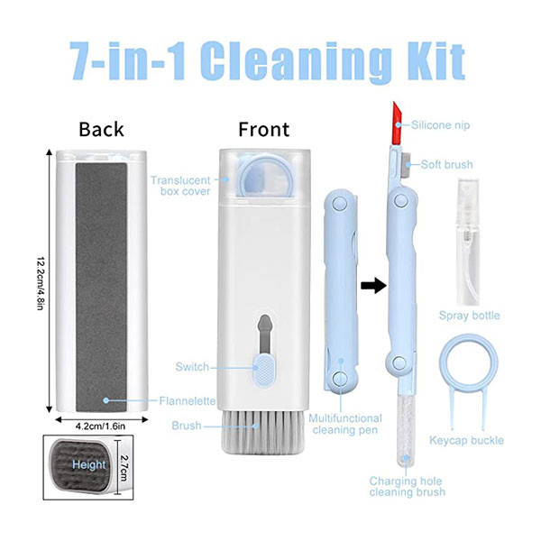 شامل ۷ ابزار حرفهای (برس نرم و پرچگالی، قلم نظافت ایرپاد با سری سیلیکونی، برس ریز، اسفنج، کلیدکش کیبورد، پارچه میکروفایبر و بطری اسپری ۵ ml)