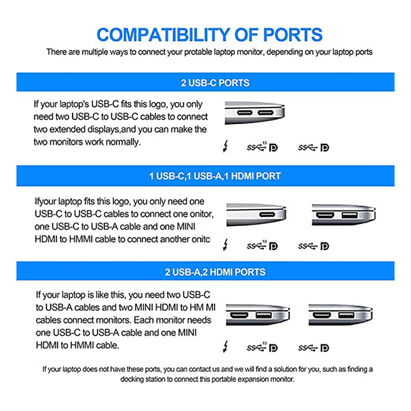 نصب و راهاندازی این مانیتور بسیار آسان است. قابلیت Plug and Play این مانیتور، شما را از نصب درایورهای مختلف بینیاز میکند. این مانیتورها توسط پایه و گیرههای مخصوص به خوبی به بدنه لپتاپ متصل میشوند. همچنین هر یک از مانیتورها دارای 3 درگاه هستند که عبارتند از یک درگاه Display Port از نوع Thunderbolt 3 / USB C 3.1، یک درگاه Mini HDMI و یک درگاه USB-C (در تصاویر گالری بالا قابل مشاهده است). لازم به ذکر است هر یک از مانیتورها برای روشن شدن باید از طریق کابل ویدئو و تغذیه به لپتاپ متصل شوند. نکتهی دیگر آنکه پورتهای USB-C همهی لپتاپها، از انتقال تصویر و ویدئو پشتیبانی نمیکنند، در نتیجه بهتر است قبل از خرید از این موضوع اطمینان داشته باشید.